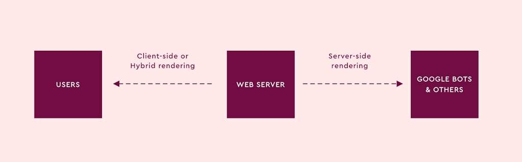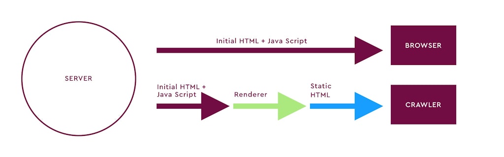 Google empfiehlt daher eine Workaround-Lösung: das sogenannte dynamische Rendering. Dabei wird zwischen clientseitig gerenderten und vorgerenderten Inhalten für bestimmte User-Agents gewechselt. Konkret bedeutet das: Für Seitenbesucher wird das HTML für die Anzeige der Seite im Client gerendert (client-site rendering). Der Googlecrawler und andere Suchmaschinen-Bots hingegen erhalten vom Server das fertige HTML (server-side rendering).
